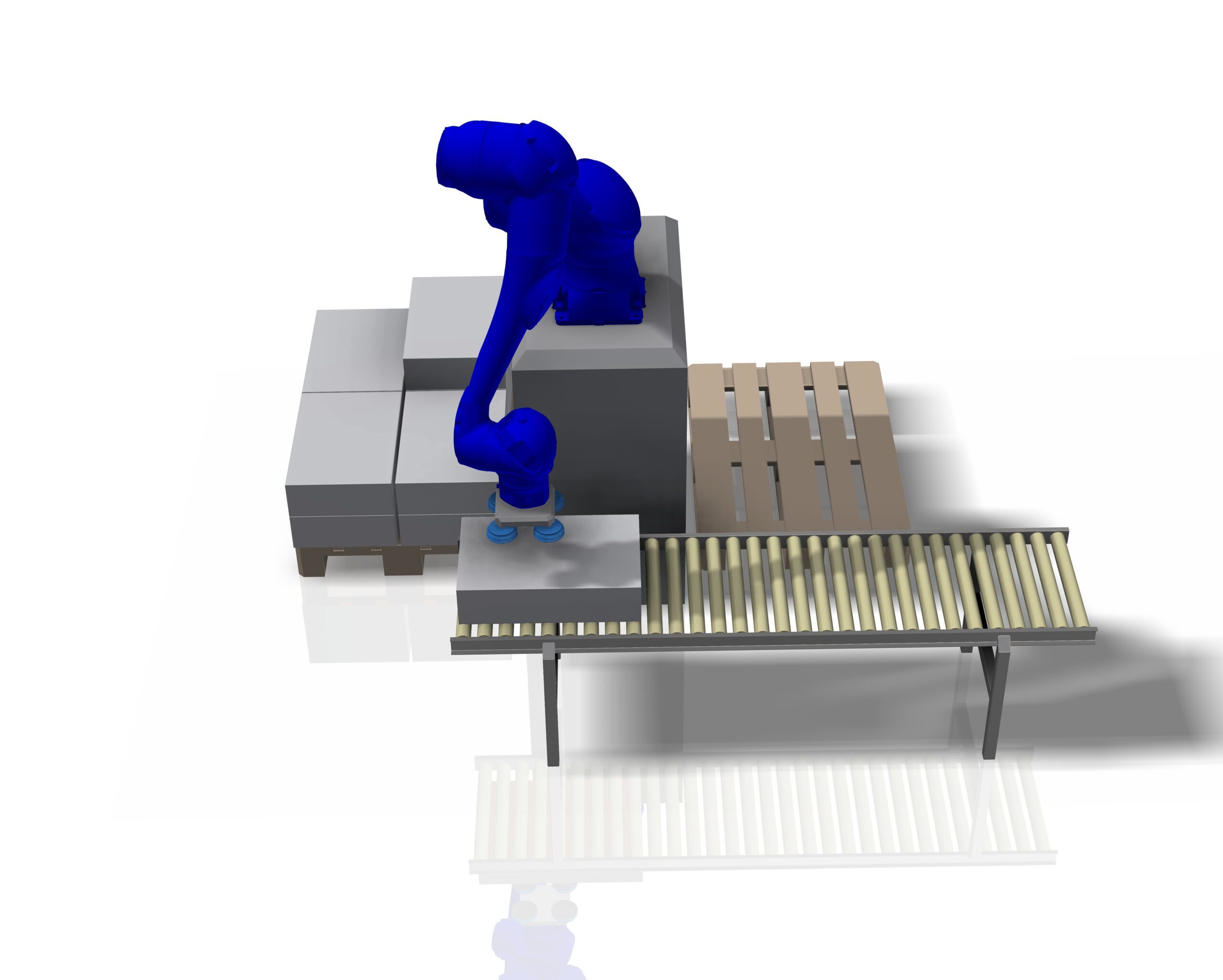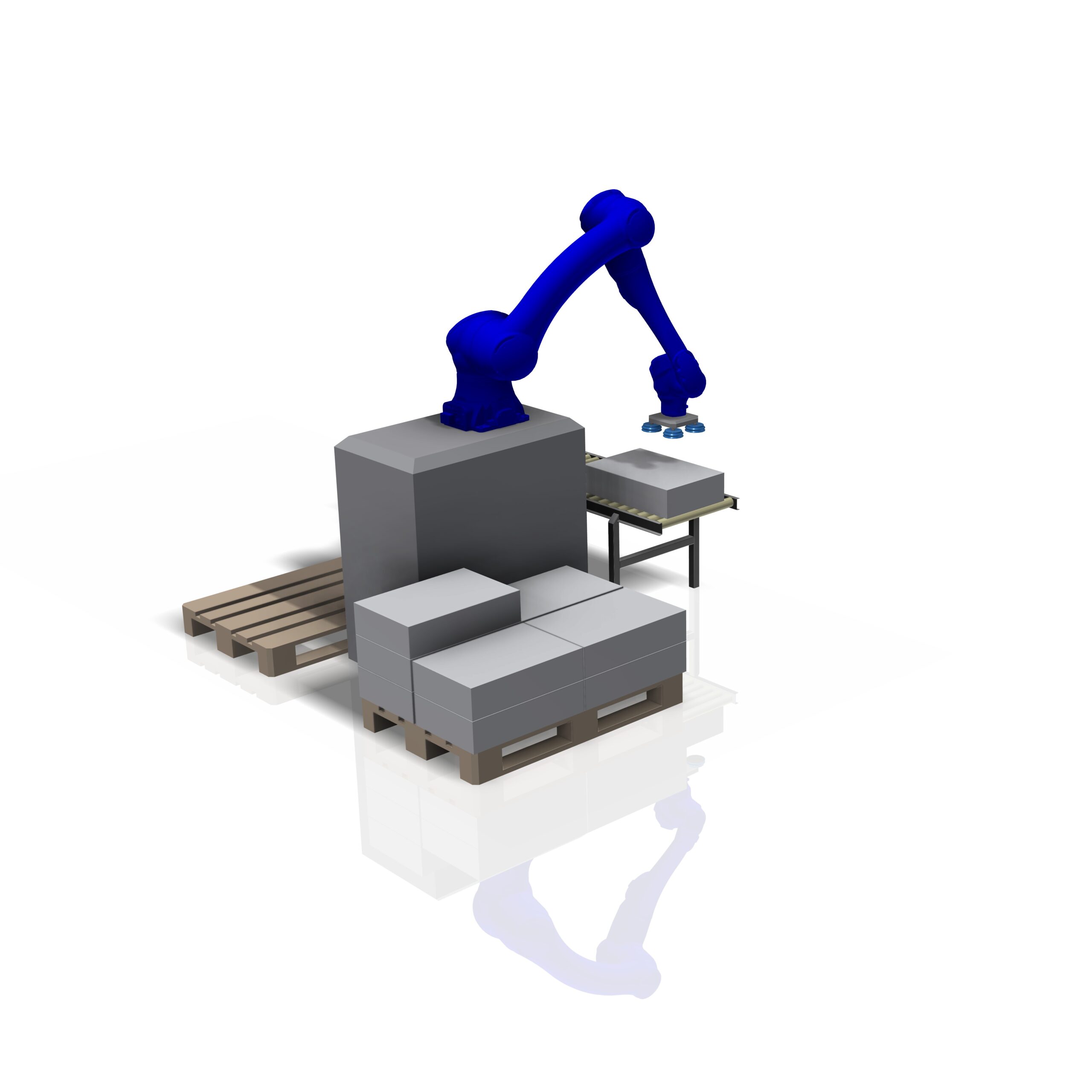 Optimize palletizing with our versatile Palletizing Cobot, which handles loads of up to 25 kg at speeds of up to 11 boxes per minute. With two pallet positions, it ensures continuous operation by automatically switching to the next pallet when the first one is full.